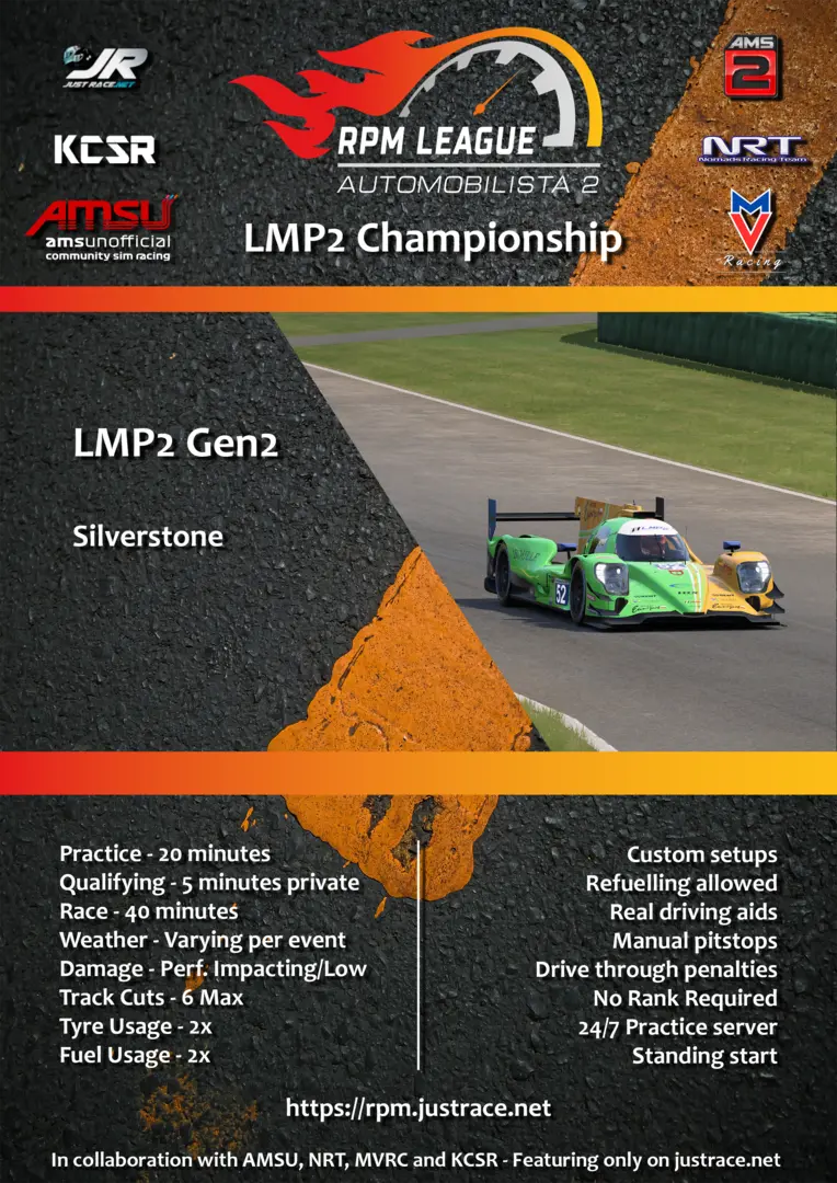 Join JustRace for some championship racing in Automobilista 2! Round 4 of 6 is on Thursday, April 9, 2026 at 8:00 PM UTC with LMP2 at Silverstone.