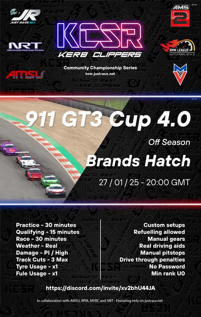 Join Kerb Clippers Sim Racing Community in Automobilista 2 from 8:00 PM UTC on Monday, January 27, 2025 with Porsche 911 GT3 Cup 4.0 | Carrera Cup at Brands Hatch for some great racing!