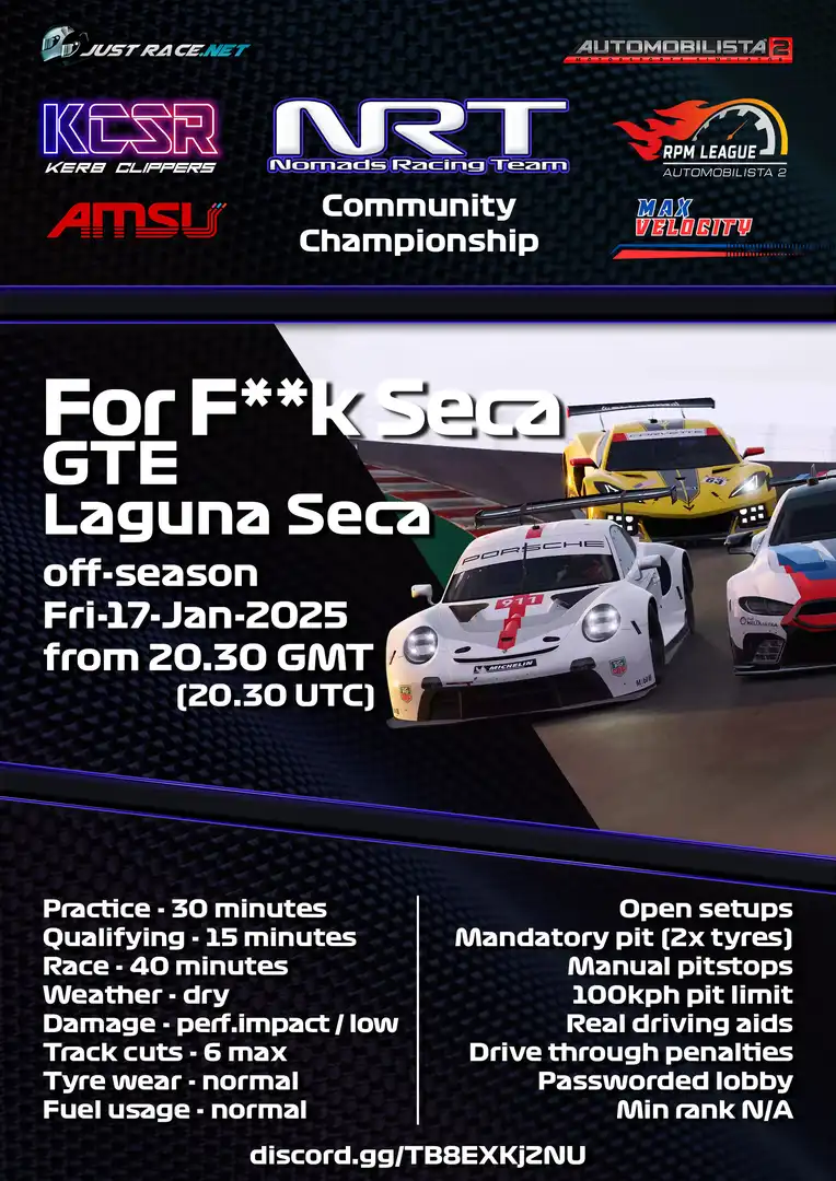 Join Nomads Racing Team in Automobilista 2 from 8:30 PM UTC on Friday, January 17, 2025 with GTE at Laguna Seca 2020 for some great racing!