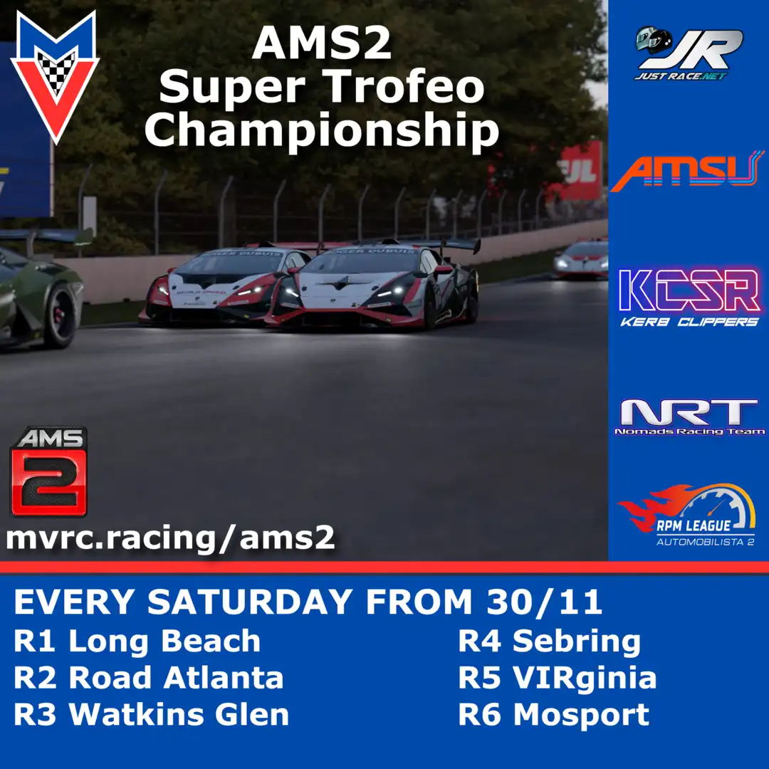 Join JustRace for some championship racing in Automobilista 2! Round 4 of 6 is on Saturday, January 11, 2025 at 7:40 PM UTC with Lamborghini Huracan Super Trofeo EVO2 | Super Trofeo at Sebring.