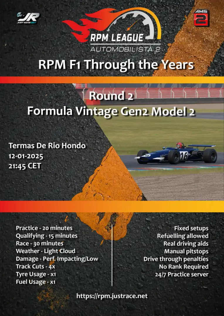 Join JustRace for some championship racing in Automobilista 2! Round 2 of 17 is on Sunday, January 12, 2025 at 8:45 PM UTC with Formula Vintage Gen2 Model2 | F-Vintage_Gen2 at Termas de Río Hondo.