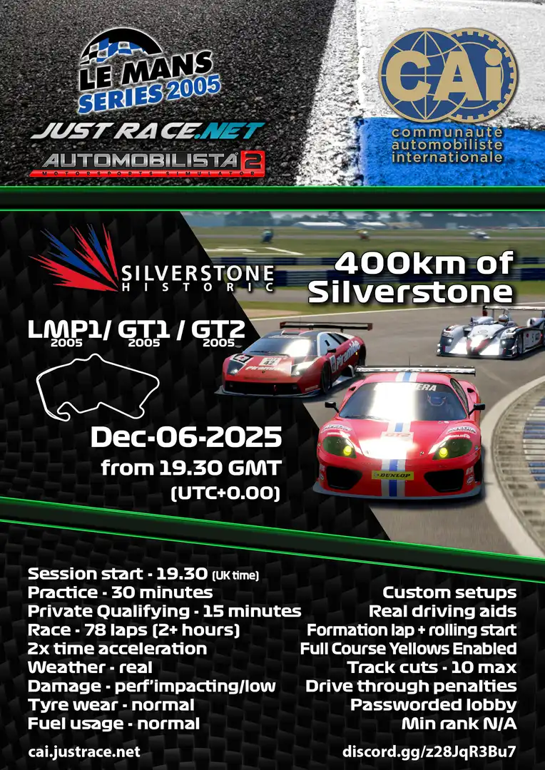 Join Communautè Automobiliste Internationale in Automobilista 2 from 7:30 PM UTC on Saturday, December 6, 2025 with GT1_05, LMP1_05, GT2_05 at Silverstone Historic 2001 for some great racing!