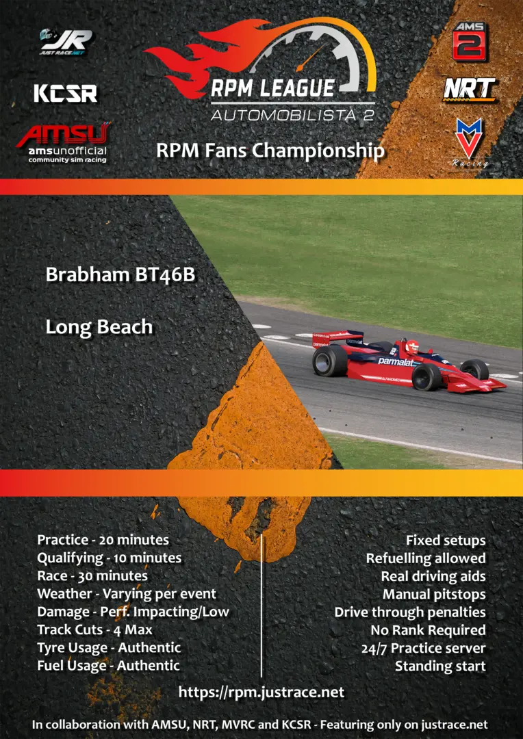 Join JustRace for some championship racing in Automobilista 2! Round 3 of 8 is on Sunday, February 8, 2026 at 9:00 PM UTC with Brabham Alfa Romeo BT46B | F-Retro_Gen2 at Long Beach.