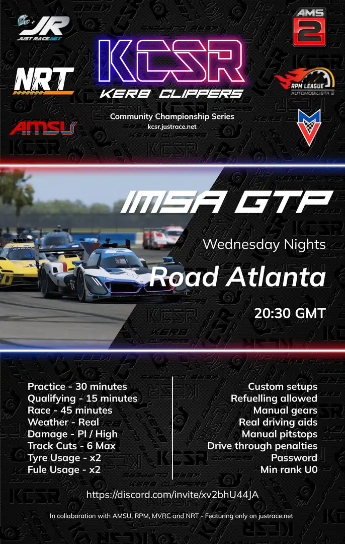 ¡Únete a JustRace para algunas carreras de campeonato en Automobilista 2! La ronda 6 de 6 es el miércoles, 12 de noviembre de 2025 a las 20:30 UTC con LMDh a las Road Atlanta.