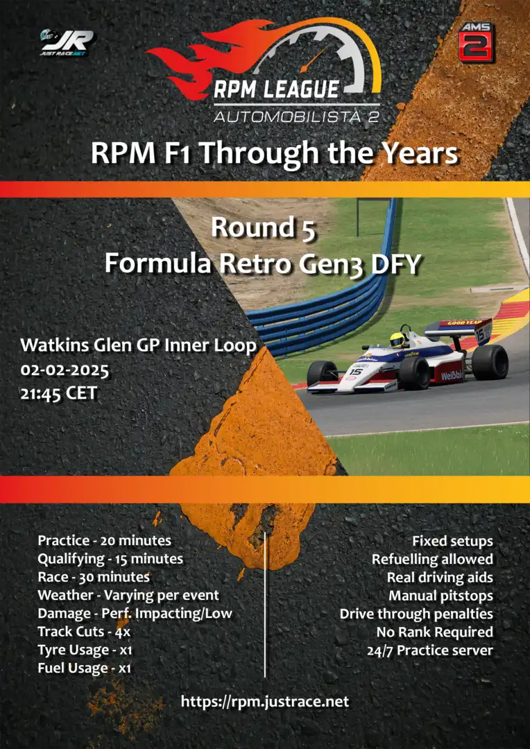 Doe mee met JustRace voor wat kampioenschapsraces in Automobilista 2! Ronde 5 van 17 is op zondag 2 februari 2025 om 20:45 UTC met Formula Retro Gen3 DFY | F-Retro_Gen3 om Watkins Glen GP (Inner Loop).