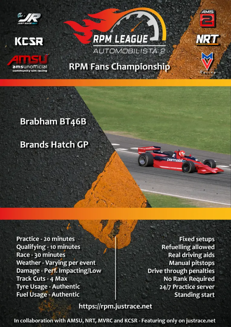 Junte-se a JustRace para algumas corridas de campeonato em Automobilista 2! Rodada 4 de 8 é em domingo, 15 de fevereiro de 2026 às 21:00 UTC com Brabham Alfa Romeo BT46B | F-Retro_Gen2 às Brands Hatch.
