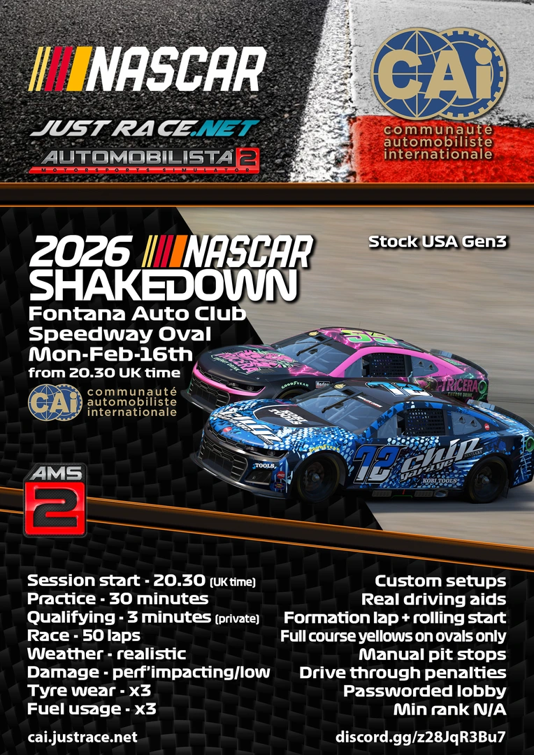 Junte-se a Communautè Automobiliste Internationale em Automobilista 2 de 20:30 UTC em segunda-feira, 16 de fevereiro de 2026 com Stock_USA_Gen3 em Auto Club Speedway Oval para ótimas corridas!